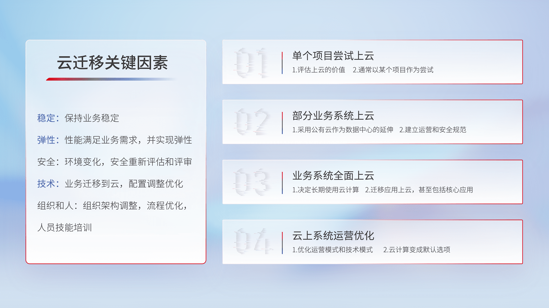 结合实际业务,,,从规划设计、、、、云平台选型、、、云原生改造、、数据迁移、、集成交付,,,,迁移全过程为客户识别最佳上云路径,,做好风险识别管理,,,,设计网络架构、、身份权限、、、安全审计合规、、操作审计、、日志审计、、、监控告警策略、、多站点容灾设计等,,,对云上基础设施进行整体规划,,提升IT治理水平,,以满足弹性、、高可用、、高性能的需求。。。。