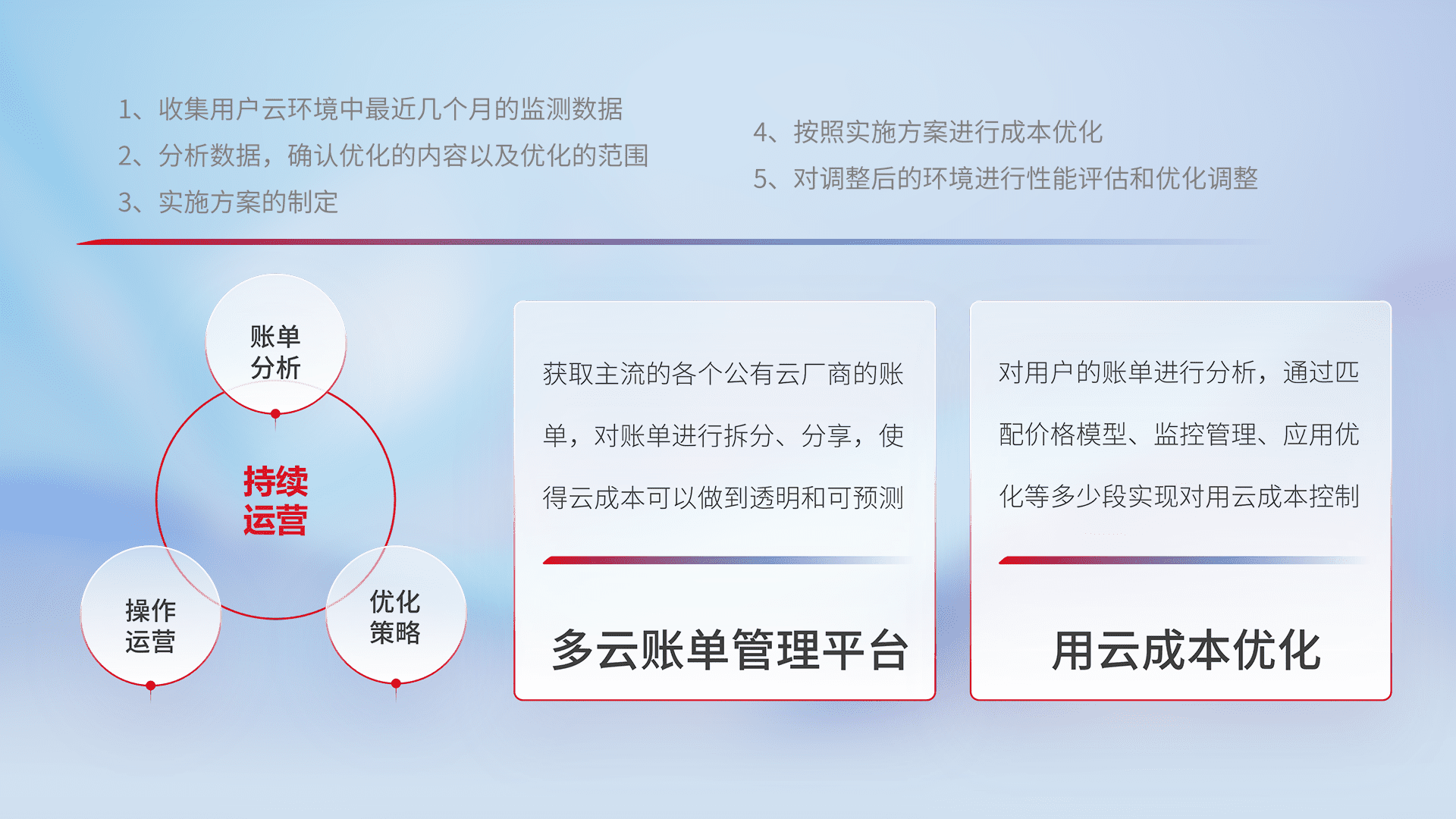 通过多云纳管,,,,以统一的资源数据模型把客户的云资源进行抽象和封装,,进而实现对多云资源的统一操作,,,,保障云资源管理的可靠性、、稳定性与可用性。。量身定制化运维内容,,,,配置、、、开发运维、、补丁管理、、、备份、、、、监控、、、认证和访问管理、、、审计和日常巡检等,,保障在用云过程中的可靠度,,,稳定度以及高可用率。。。